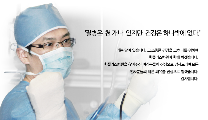 항상 현실에 안주하지 않고 더 나은 진료 서비스를 위하여 노력하고 정도(定道)의 길을 걷는 힘플러스병원이 되겠습니다.